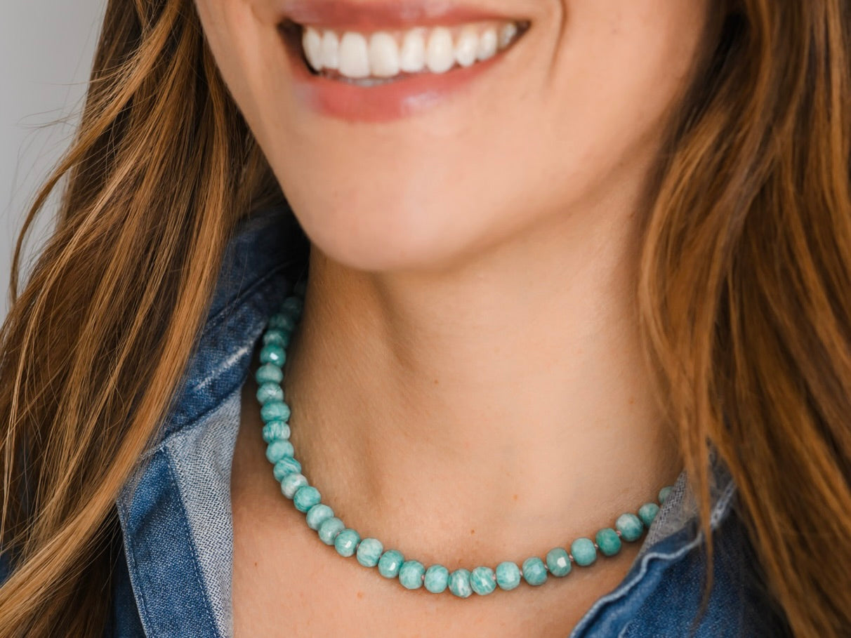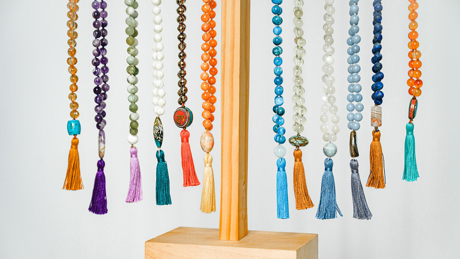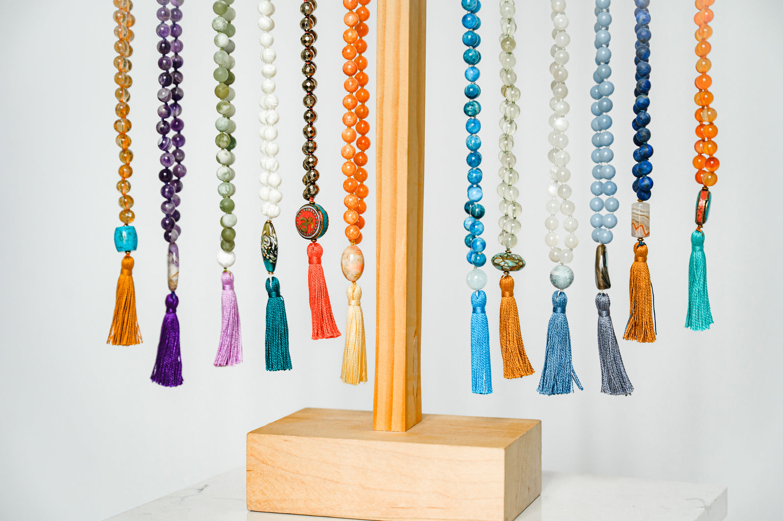 shop gemstone malasHand-knotted with a fun, contrasting color thread, our adjustable length gemstone necklaces are designed as bold statement pieces, perfect for everyday wear or special occasions. Featuring high-quality rondelle shaped gemstones, each necklace showcases the natural beauty and energy of the stones while offering versatility in length.