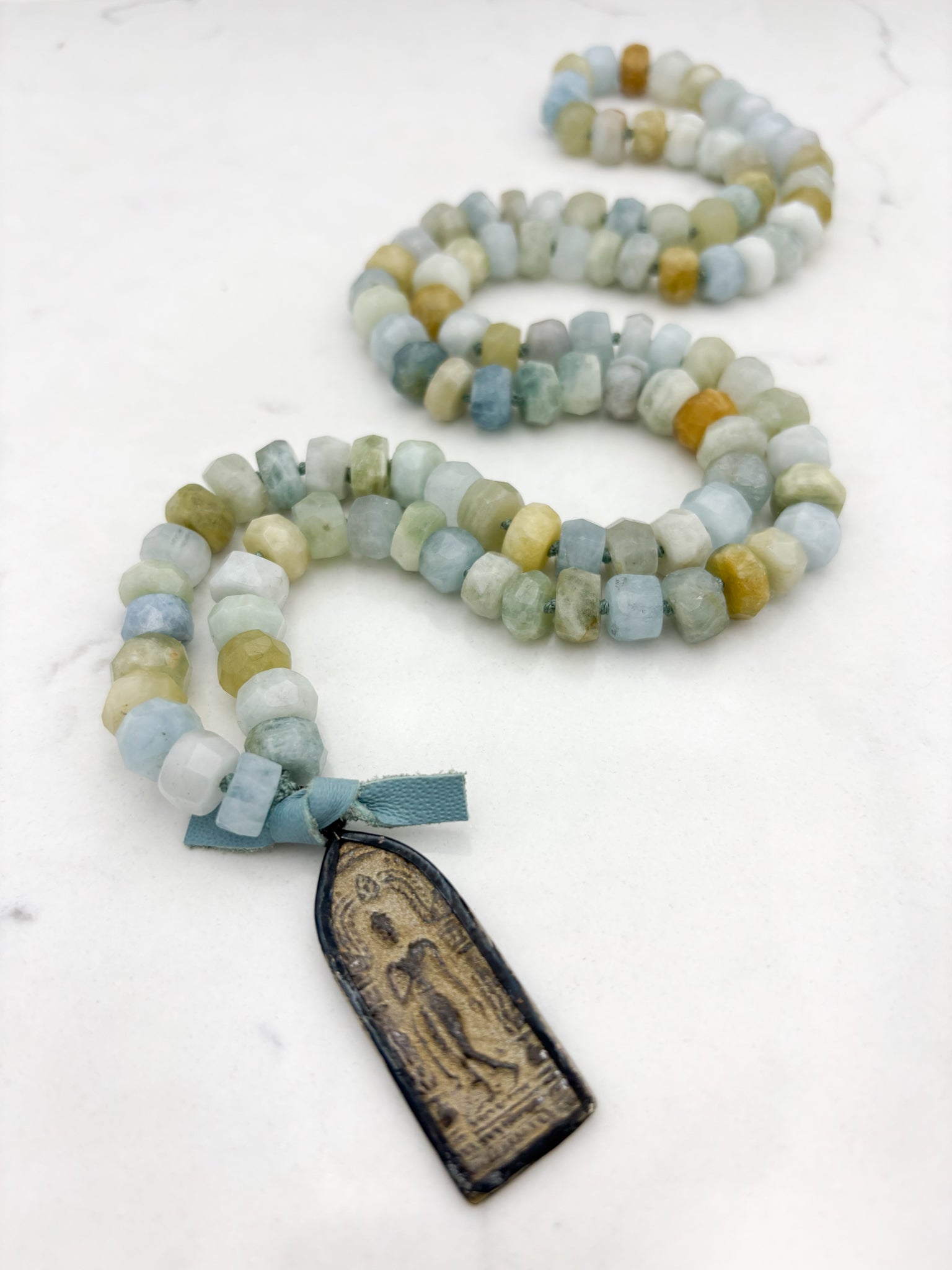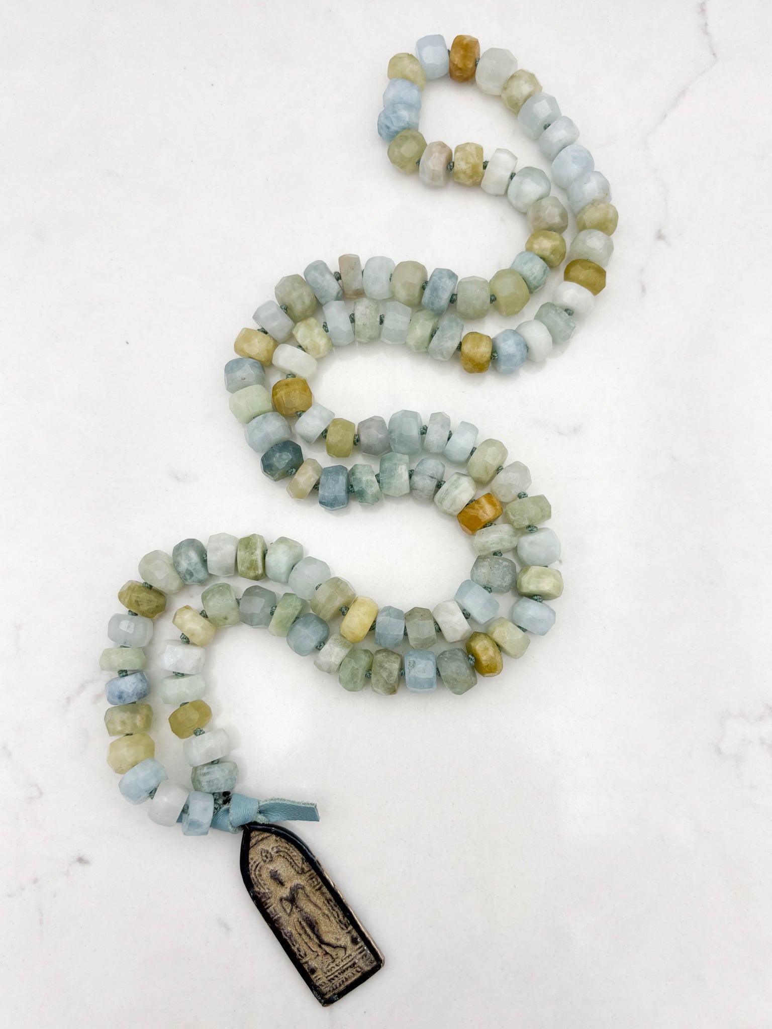 Aquamarine, known as the stone of courage, radiates a gentle, compassionate energy that soothes stress and calms the mind. This beautiful blue-green gemstone mala helps to clear the throat chakra, promoting clarity and enhancing communication. In ancient lore, Aquamarine was treasured by sailors as a protective talisman and was believed to be the cherished treasure of mermaids.