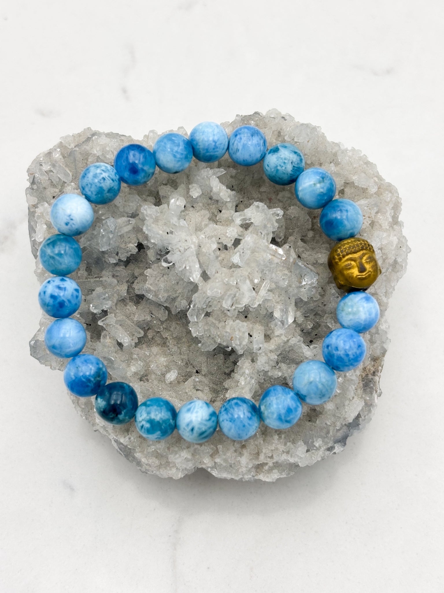 Blue Apatite, known as the stone of manifestation, promotes spiritual alignment, enhances communication, and supports authentic self-expression. This striking blue gemstone bracelet inspires creativity and intellect, clearing confusion and opening the mind to insights that serve the greater good. When activated, Apatite expands awareness, deepens knowledge, and unveils truth while easing feelings of sorrow, apathy, and anger. It helps reduce irritability and emotional exhaustion, fostering a sense of calm, clarity, and renewal.