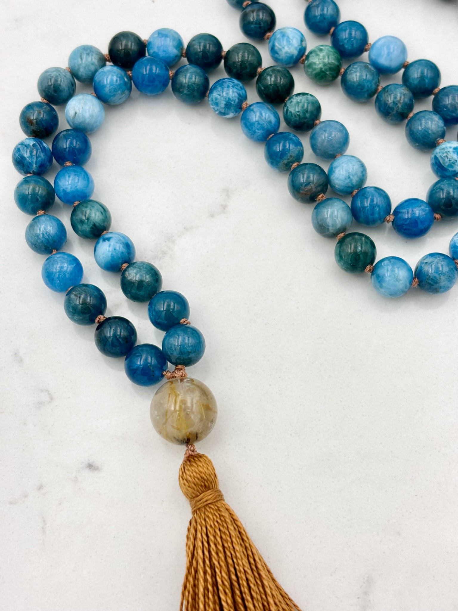 Blue Apatite, known as the stone of manifestation, fosters spiritual alignment, enhances communication skills, and supports self-expression on all levels. This stunning blue mala necklace stimulates creativity and intellect, clearing away confusion and providing access to insights that benefit the collective good. When activated, Apatite expands knowledge and truth while easing sorrow, apathy, and anger. It helps reduce irritability and alleviates emotional exhaustion, promoting a sense of calm and renewal.