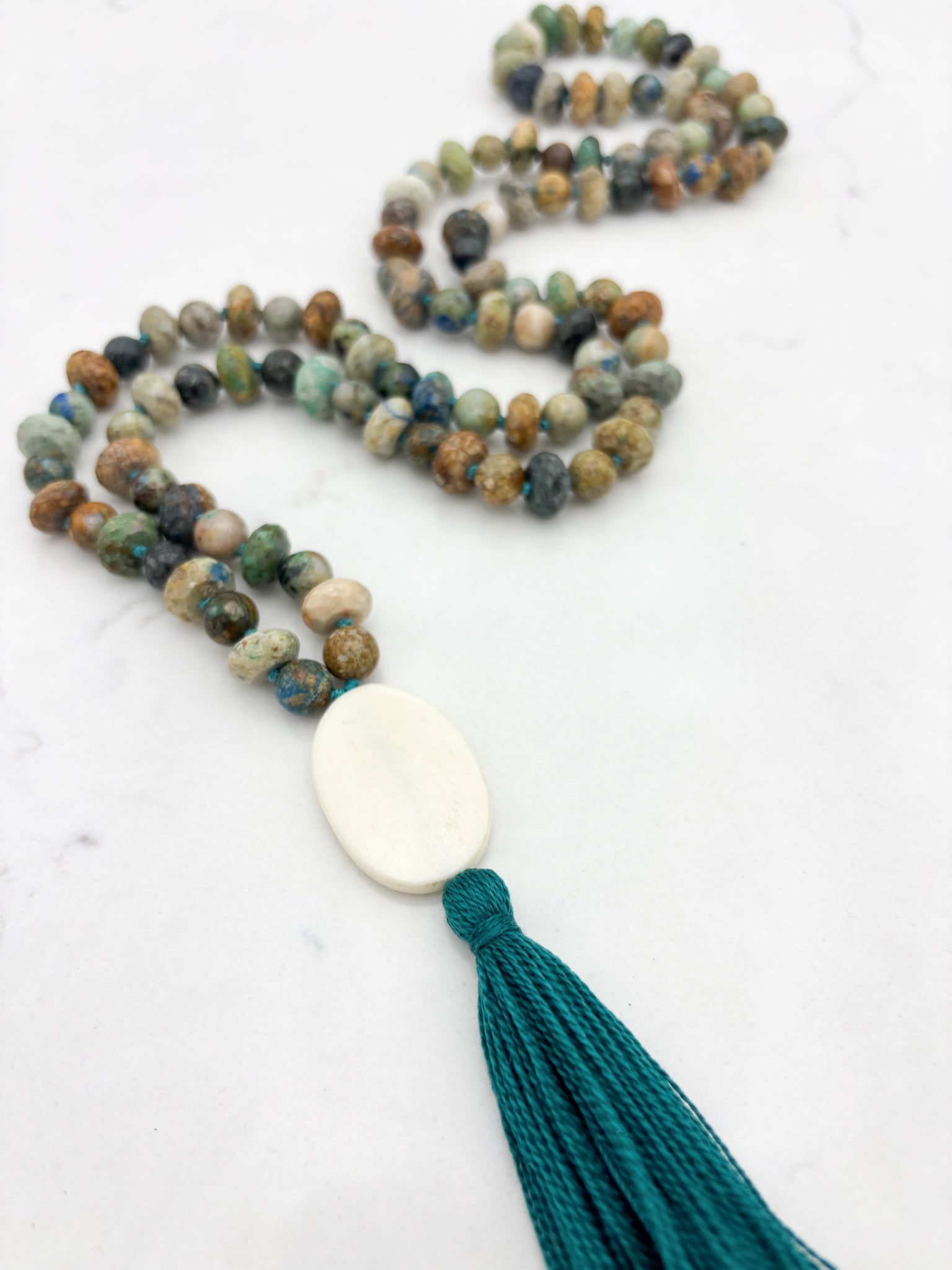 Our Chrysocolla mala necklace helps you accept situations that are constantly changing, invoking great inner-strength. This beautiful blue-green stone calms, cleanses, and reenergizes all the chakras and aligns them with the divine. At the heart chakra, it heals heartache and increases the capacity to love. Chrysocolla encourages self-awareness and inner balance, and imparts confidence and sensitivity. Wear this mala when you want to enhance your personal power and inspire creativity.