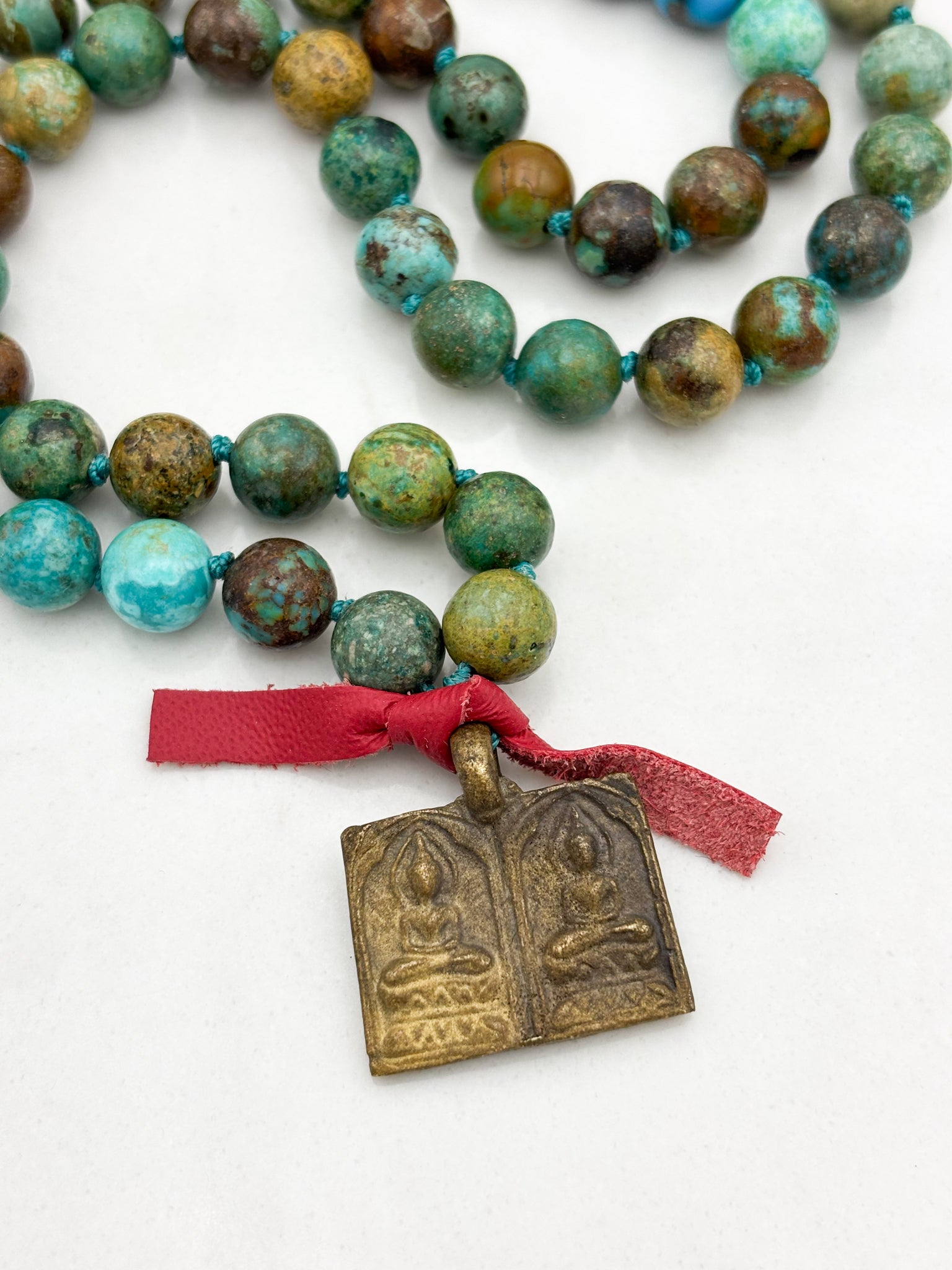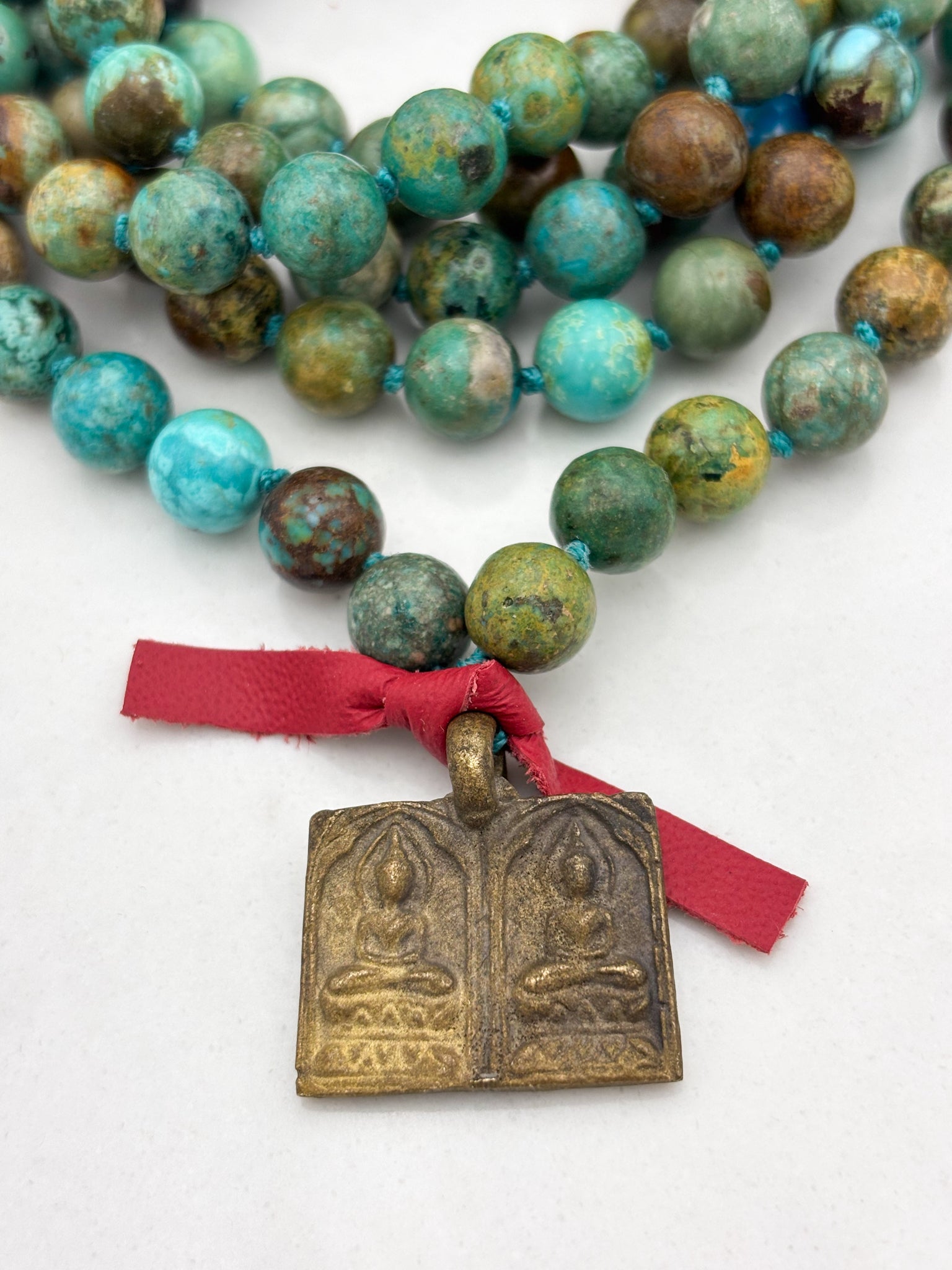 Turquoise is a powerful healing stone that brings comfort to the spirit and promotes physical well-being. As a stone of wholeness and truth, it harmonizes and activates the throat chakra, enabling clear communication and the authentic expression of your deepest wisdom. Wearing our Turquoise mala serves as a reminder of your unique and valuable contributions to the world. This vibrant stone fosters emotional balance, supports inner harmony, and enhances your sense of purpose, making it a cherished ally for overall well-being.